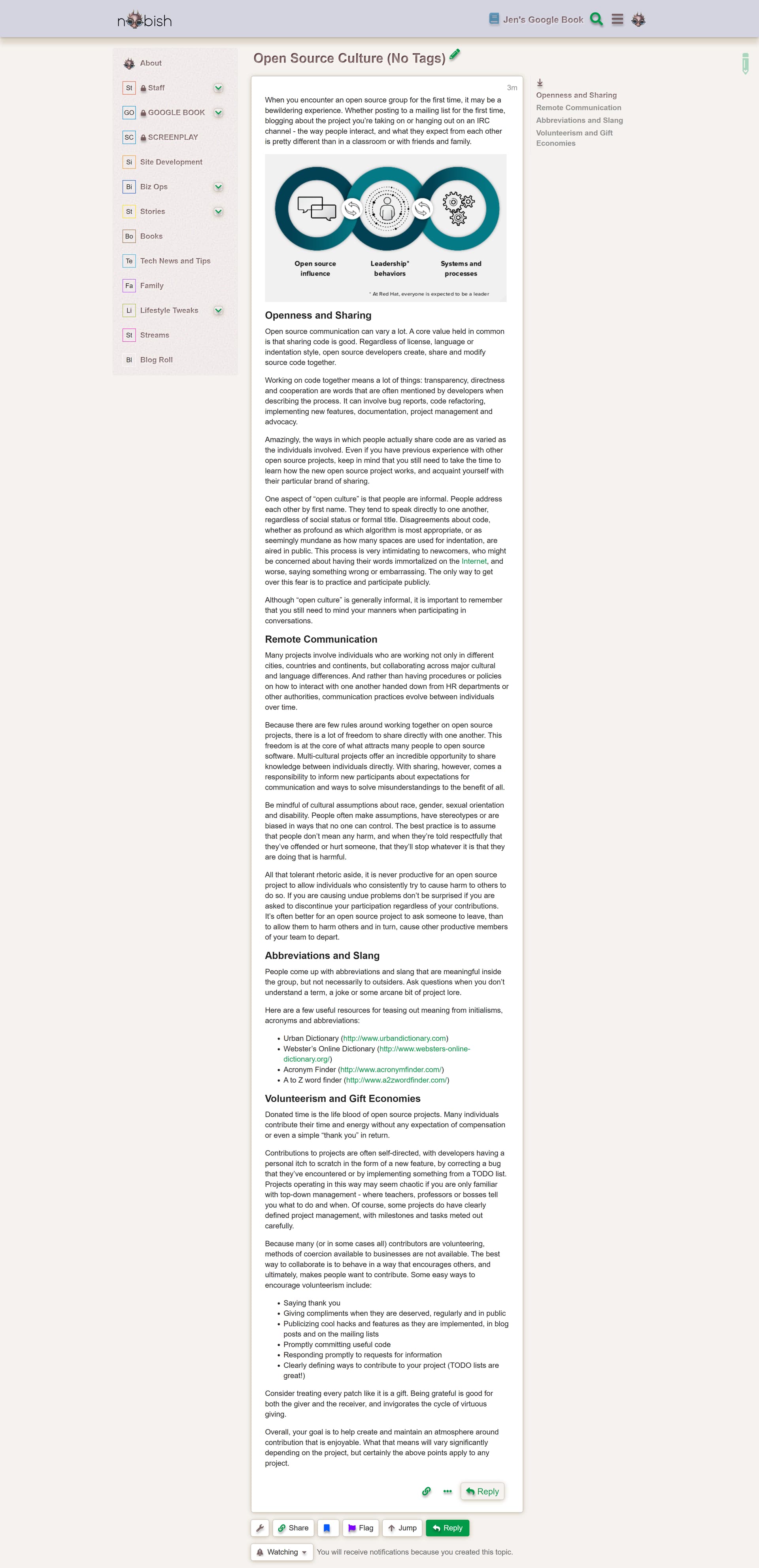One aspect of “open culture” is that people are informal. People address each other by first name. They tend to speak directly to one another, regardless of social status or formal title. Disagreements about code, whether as profound as which algorithm is most appropriate, or as seemingly mundane as how many spaces are used for indentation, are aired in public. This process is very intimidating to newcomers, who might be concerned about having their words immortalized on the Internet, and worse, saying something wrong or embarrassing. The only way to get over this fear is to practice and participate publicly.